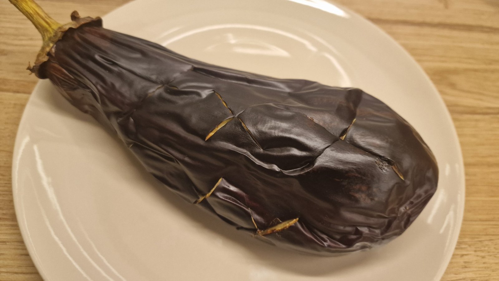 • Bag den hele aubergine ved 200 °C i 25 minutter.